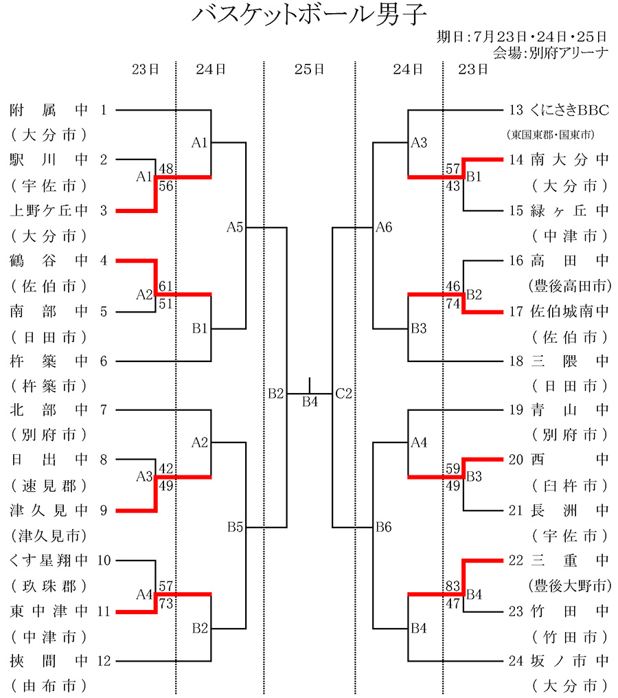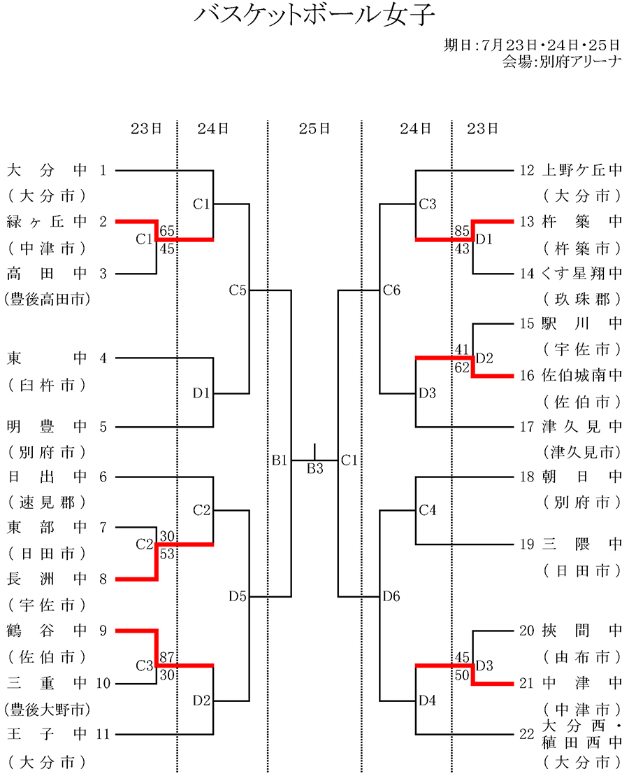 令和7年度 第63回大分県中学校総合体育大会 バスケットボール競技1日目の結果が決定しましたのでお知らせします。