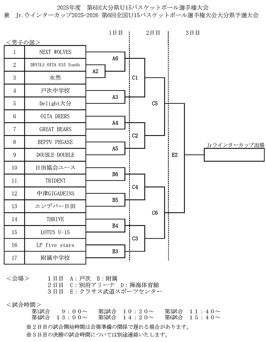 2025年度 第6回大分県U15バスケットボール選手権大会 兼 Jr.ウインターカップ2025-2026 第6回全国U15バスケットボール選手権大会大分県予選会 組合せ